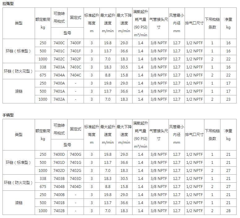 Rated load 250 - 1000 kg Product features Use alloy lifting chain to lift heavy load; or use stainless steel chain to lift medium load. Suitable for high working level brake device. Multi blade motor has high torque and smooth start and operation. Finish machined heat treated alloy steel gears. Optional pull rope type and handle type. Yale gourd is light and economical, and can accurately control the load. Handle type control, ergonomic design, simple operation with one hand. Hook type or fixed type are available. The rotary air inlet with filter screen is adopted. Aluminum shell and end cover make the gourd light weight, easy to carry, and durable. External adjustable brake device. Standard upper and lower limit device. Precision machined alloy steel transmission and heat-treated spur gear are perfectly matched to provide a compact mesh gear reducer with compact design. Exhaust port is 1 / 2 NPTF, additional muffler can be added to make the operation more quiet. Product options Flameproof flower option - can be used in the presence of combustible substances. ![]() ![]() |